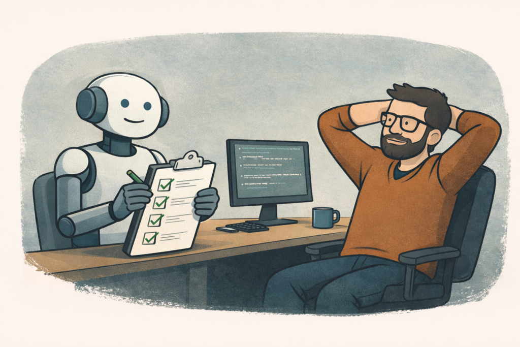 Das bedeutet nicht, dass ich nichts mehr tue. Es bedeutet, dass ich anders arbeite: Ich orchestriere, ich reviewe, ich beaufsichtige. Wie ein Chef, der einen brillanten, aber manchmal zerstreuten Mitarbeiter einarbeitet.